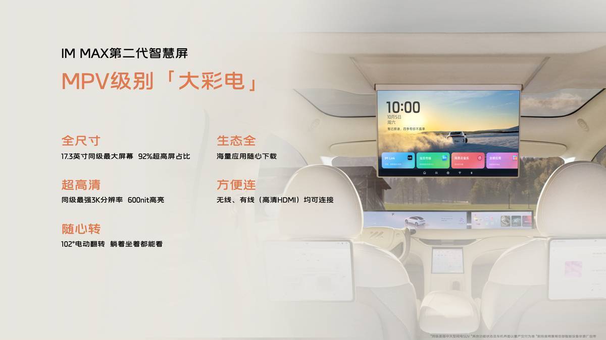 “MPV级大彩电”IM MAX第二代智慧屏全系上车是“升舱”的一大亮点,与LS6独有的“零重力、贵妃椅、大床房”三躺模式绝妙搭配,拓展出百变空间,坐着躺着观影都舒服,实现“移动头等舱”的娱乐自由。同级最大17.3英寸3K高清屏幕,联动全车21个扬声器打造的WANOS 7.1.4 全景声场,打造剧院般沉浸视听享受。作为全能座舱,它既是带娃神器,又可以化身双人浪漫的私享影院;露营时,K歌房或Switch游戏空间自如切换,快乐翻倍;甚至紧急会议时还能投屏移动办公,每一位成员的需求都能得到充分满足。